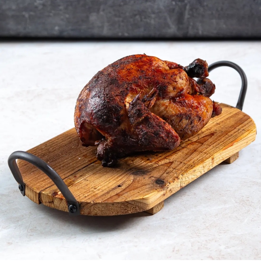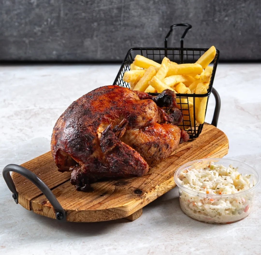 Soczyste skrzydełka zanurzone w sosie Luisiana BBQ podawane z porcją frytek. -